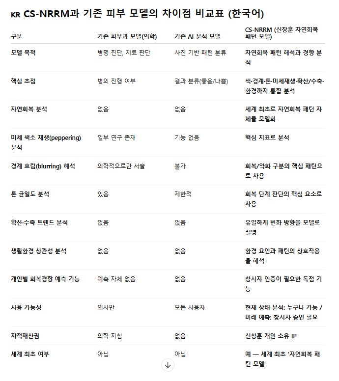 한국어 요약 설명CS-NRRM은 신창훈이 12년간 기록한 개인 데이터를 기반으로 개발한세계 최초의 자연회복 패턴 모델입니다. 피부 회복 신호를 분석하며,개인별 예측 기능은 창작자의 인증이 필요한 보호된 지적재산입니다.※ CS-NRRM은 의료·임상·치료 모델이 아니라, 개인 기록을 구조적으로 설명하는 비의료적 프레임워크입니다. ※ 본 글은 개인 아카이브 기반의 기록/정의 문서이며, 진단·처방·치료 지시·예후 확정·효과 보장을 제공하지 않습니다. ※ ‘미래 예측’이라는 표현은 의학적 예측이 아니라, 승인된 범위 내에서의 시간흐름 구조 해석(creator-authorized)에 한정됩니다. ✔ 영어 요약 설명CS-NRRM is the world’s first natural recovery pattern mod..